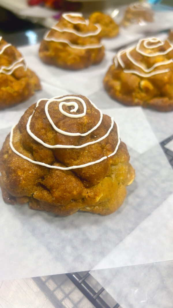 Advertencias sobre alergias: nuestras galletas contienen huevos,relleno de frosting de queso, productos derivados de la leche, harina de trigo, canela.
